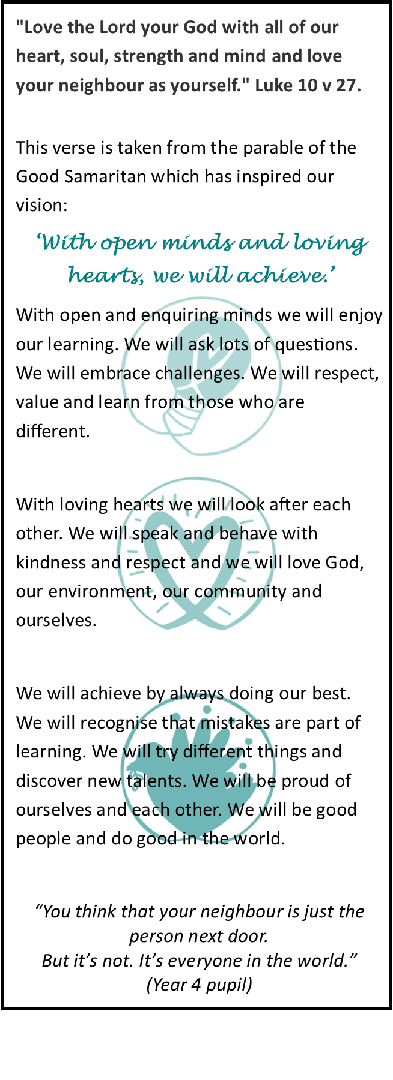 'This school has a good sense of community and respect. Our Christian Values hold up the pillars of our school and makes an easy and compassionate learning evironment.' (Year 6 pupil)