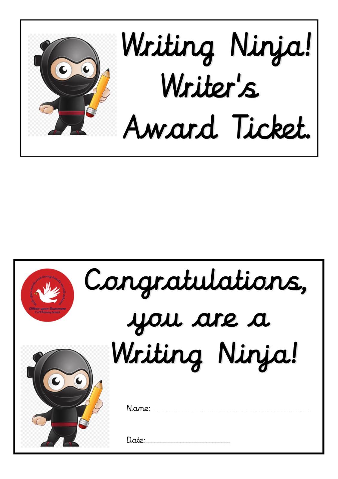 During writing sessions, children can earn themselves a Ninja Writer’s Ticket. These are awarded for effort and for meeting the expectations for the genre they are working on. At the end of each half term, our Writing Gang members will randomly pick one Ninja Writer’s Ticket from each year group, and these children will be awarded a certificate and choose a fancy notebook and a stylish pen or pencil.
